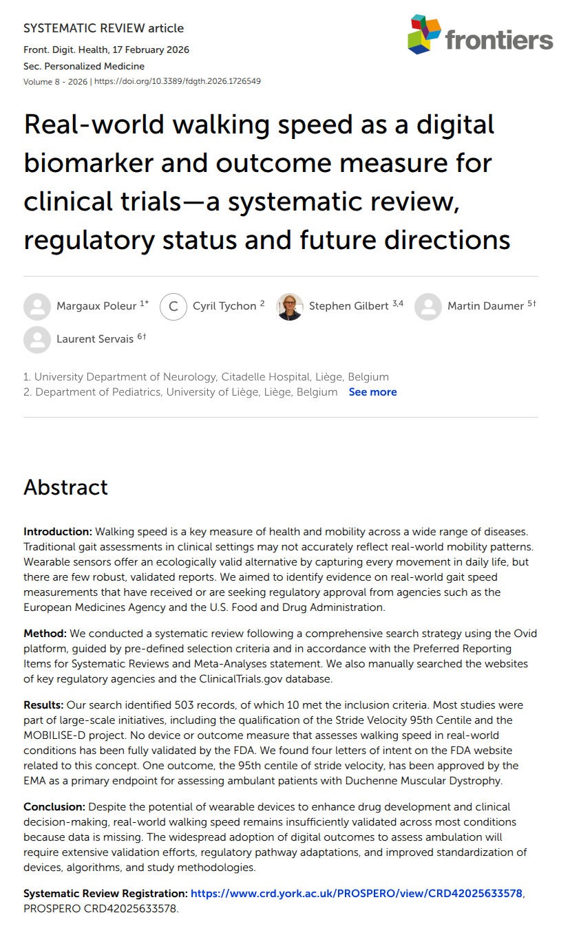 A new systematic review in Frontiers in Digital Health provides a clear and actionable blueprint toward regulatory acceptance of real-world walking speed (RWS) as a clinical trial outcome, particularly in diseases where the 6-minute walk test (6MWT) is already regulator-familiar (e.g., MS, neuromuscular disorders, and also cardiovascular disease).